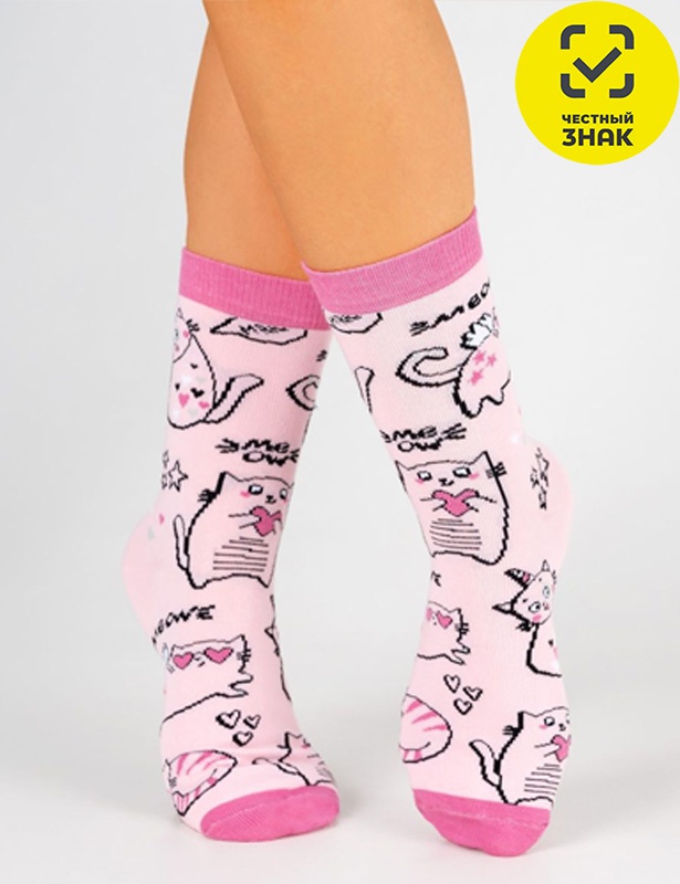 Детские носки с кошками, изображенными по всей длине изделия. Натуральный гребенной хлопок в составе подарит ногам ощущения мягкости и повышенного комфорта в течение всего дня.