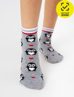 Детские носки с рисунком пингвинчика. Носочки связаны из натурального гребенного хлопка, такие изделия не электризуются, комфортные, тактильно приятные, воздухопроницаемые. Борт модели с люрексом добавит блеска и новогоднего настроения. Очаровательный рисунок пингвинчика покорит как ребенка, так и взрослого. Такие носочки станут отличным дополнением к подарку.