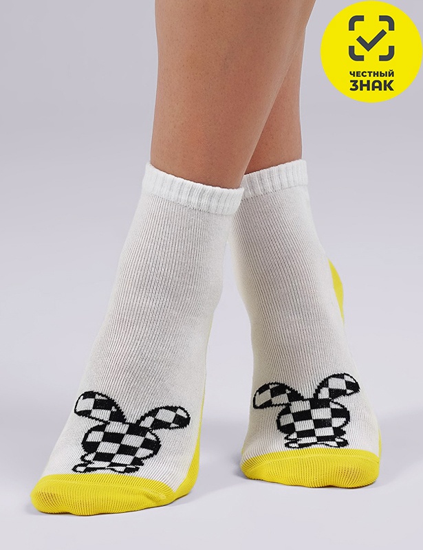 Носки для девочки с рисунком «шахматный зайчик» на мыске, двубортная резинка, средний паголенок.