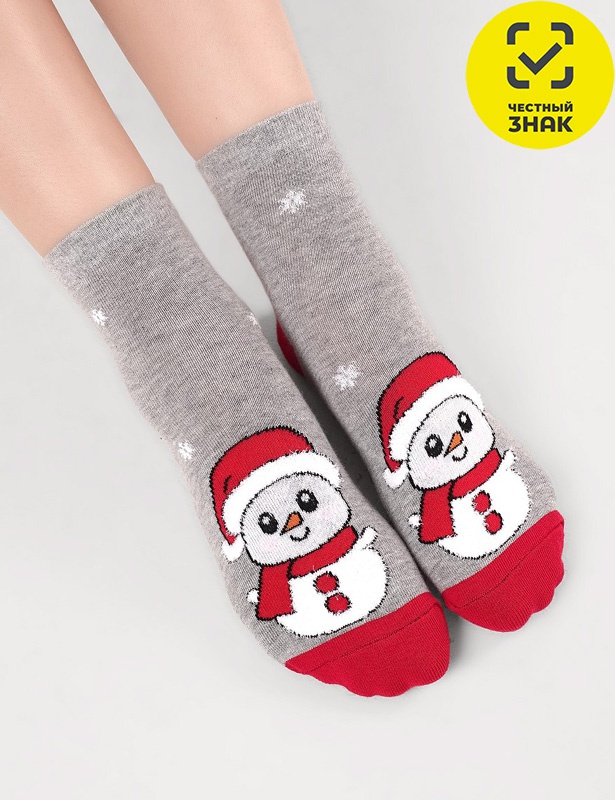Детские носки с выделенным мысом и пяткой с рисунком снеговика, тело снеговика и отворот колпака выполнены из пряжи травка.