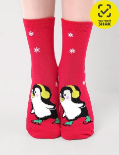 Носки детские с рисунком пингвина на коньках и в наушниках, грудка пингвина выполнена из пряжи травка