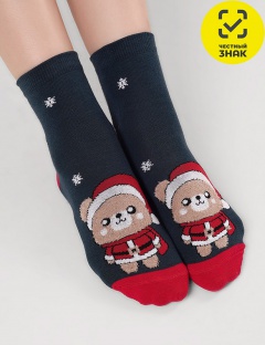 Носки детские с выделенным мыском и пяткой, с рисунком медведя в новогоднем костюме, тело медведя выполнено из пряжи травка.