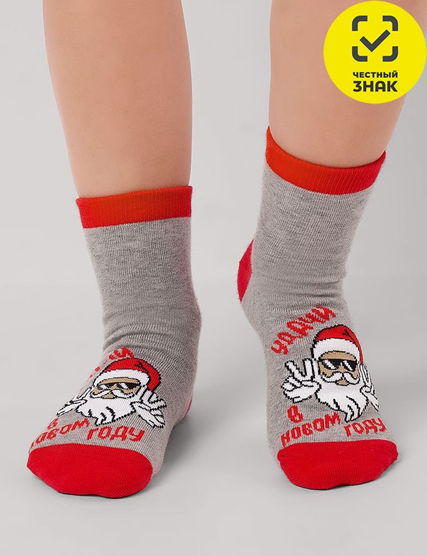 Детские носки с выделенным мыском, пяткой и бортом, с рисунком лицо деда мороза и надписью удачи в новом году.