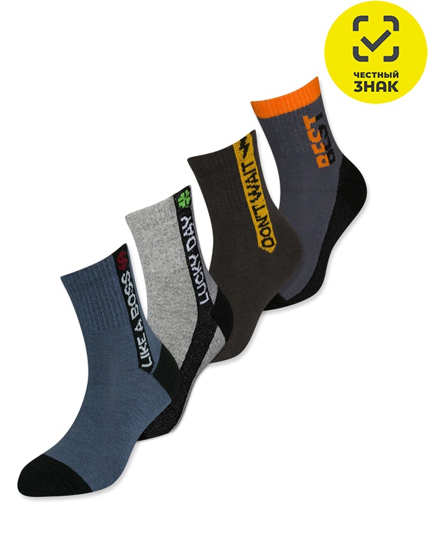 Яркие носки для мальчика с надписями: "LIKE A BOSS", "LUCKY DAY", "DON'T WAIT" и "BEST" на паголенке. Средний паголенок. Верхний край носков выполнен с плотной резинкой для комфортной фиксации на ноге.
