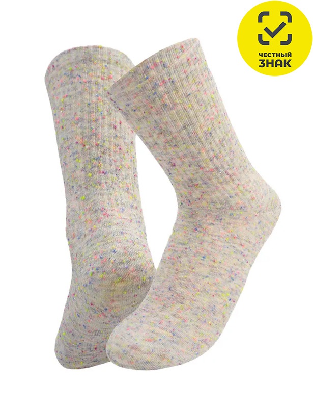 Демисезонные носки для девочки с высокой резинкой и применением в основе эксклюзивной фасонной пряжи "непс", дополненной нитью люрекс.
