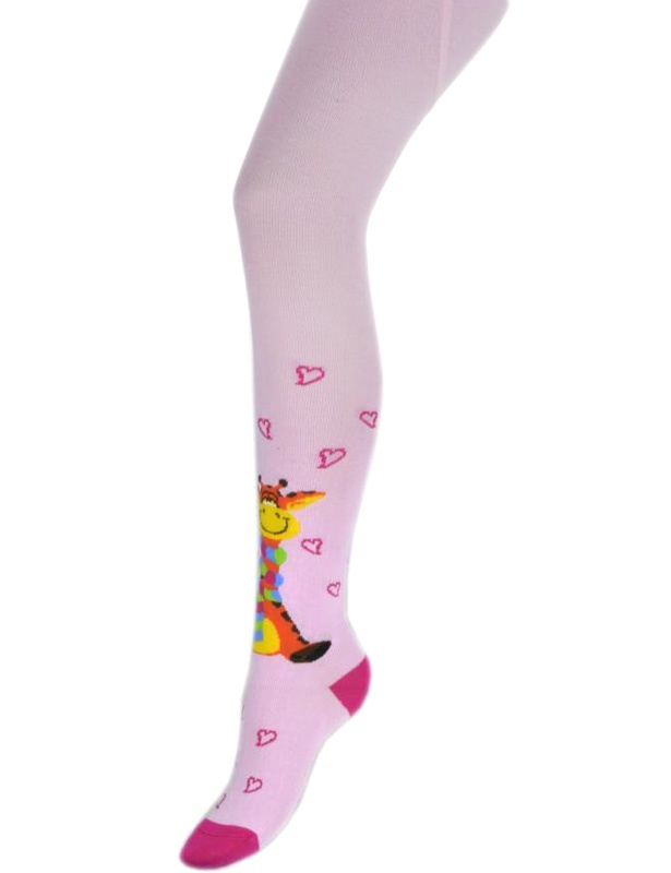 Однотонные демисезонные колготки для девочки. Декорированы крупным рисунком «жираф» на передней части ножки и «мелкими сердечками» по всей ножке.