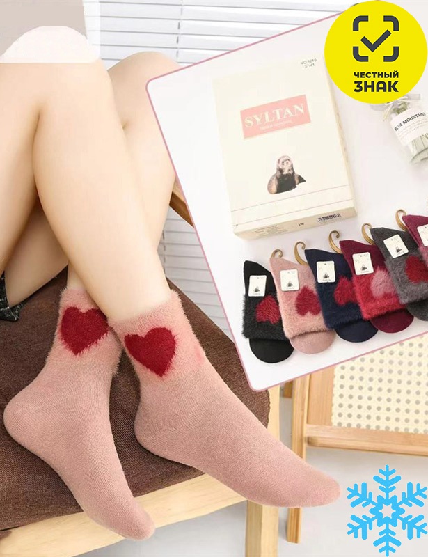Носки женские из шерсти, высокий махровый паголенок с рисунком "сердечко".