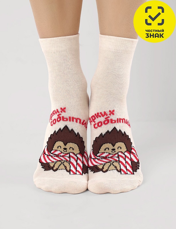 Носки женские с рисунком Ёжик в красочном шарфике и надписью Ярких событий!