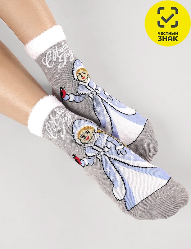 Женские носки с рисунком снегурочки, надписью с новым годом, борт выполнен из пряжи травка