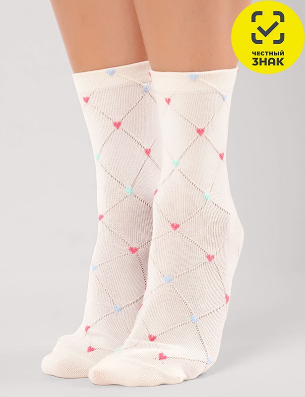 Женские носки в сочетании рисунка ромб и разноцветными сердечками.