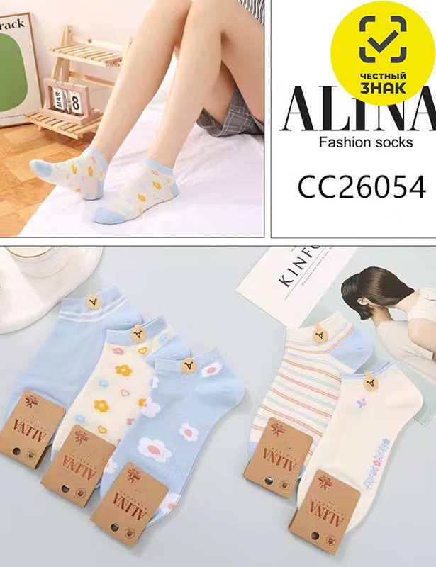 Производитель: ТМ Алина Артикул: CC26054 носки женские Пол: ЖЕНСКИЙ Полотно: гладь с рисунком Состав: 80% хб, 15 па, 5%эл Возраст: взросл