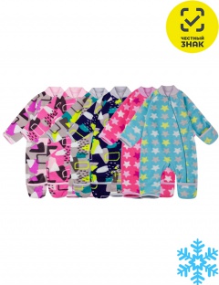Комбинезон ясельный с длинным рукавом из набивного флиса, ручки и ножки можно открыть или закрыть по желанию, молния проходит по косой по всей длине комбинезона, края изделия обработаны гладким интерлоком.