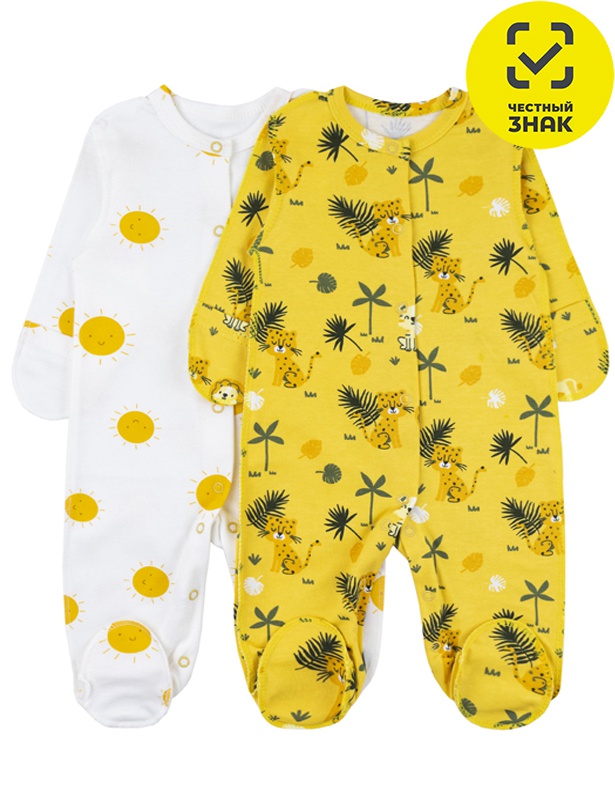 Комплект комбинезонов состоит из 2 шт. Комбинезоны из набивного интерлока, с длинными втачными рукавами с царапками, закрытая ножка, центральная застежка на кнопки. Цена указана за комплект из 2 шт.