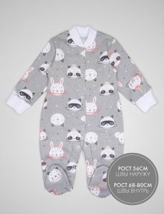 Комбинезон ясельный из трикотажного полотна футер с набивным рисунком, с застежкой на кнопки по центру и по шаговому шву. В размере 18 ростовка 56 швы наружу.