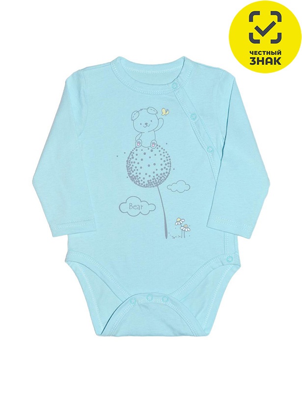 Полукомбинезон (боди) ясельный, застежка асимметричная на переде слева (справа) и по низу изделия на кнопки. Рукав втачной длинный, печать по переду. Горловина, край борта и низ изделия окантованы.
