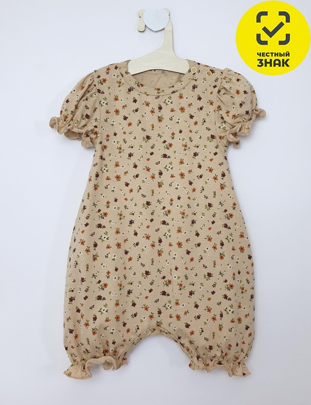 Полукомбинезон-песочник свободный, рукав короткий "фонарик". Горловина окантована, застежка в плече и по шаговому на кнопки. Внизу ножки собраны на резинку-венгерку.