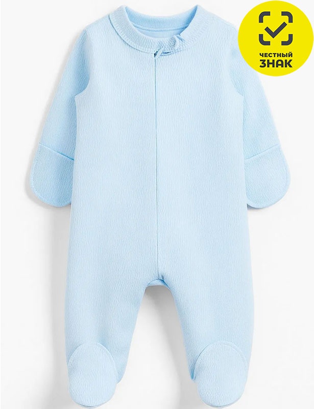 Êîìáèíåçîí äëÿ íîâîðîæäåííîãî èç ãëàäêîêðàøåíîãî èíòåðëîêà, äëèííûé çàêðûòûé ðóêàâ, çàêðûòàÿ íîæêà, öåíòðàëüíàÿ çàñòåæêà íà ìîëíèþ, âîðîò îêàíòîâàí è ñ çàñòåæêîé íà êíîïêó.