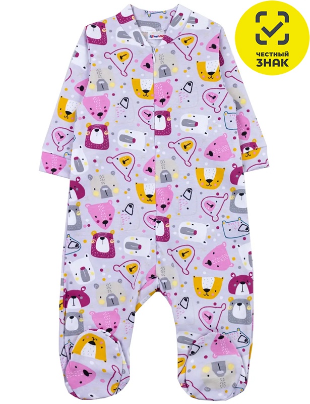 Комбинезон ясельный из набивного интерлока, длинный открытый рукав на манжете, центральная застежка на молнию, воротник-стойка, закрытая ножка.