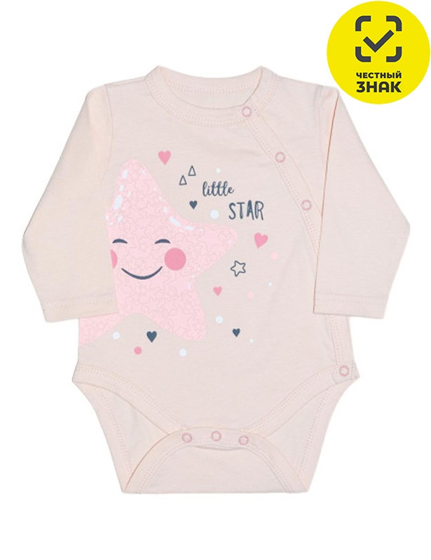 Боди выполнено из кулирного полотна (100% хлопок). Спереди асимметричная застежка на кнопках. Рукав втачной, длинный. Печать по переду. Горловина, край борта и низ изделия окантованы.