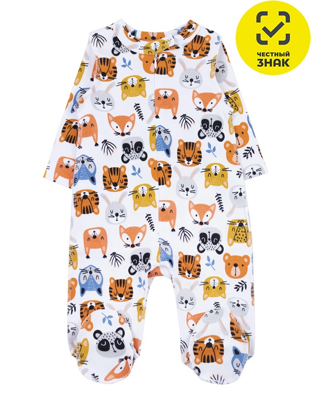 Комбинезон ясельный из набивного полотна, длинный открытый рукав на манжете, центральная застежка на молнию, воротник с кнопкой, закрытая ножка.