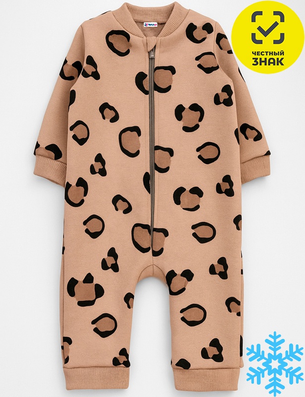 Комбинезон ясельный из набивного футера трехнитки с начесом, длинный открытый рукав с манжетом, центральная застежка на молнию, воротник-стойка, открытая ножка.
