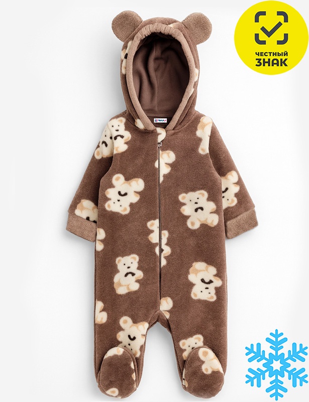 Комбинезон ясельный из флиса, с капюшоном, длинный втачной рукав, застежка на молнию, закрытая ножка. Капюшон декорирован ушками.