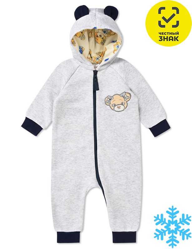 Комбинезон ясельный из интерлока, серого-меланжевого цвета, с капюшоном и открытыми ножками, застежка на молнию. Украшен вышивкой, подклад из хлопка, на капюшоне ушки.