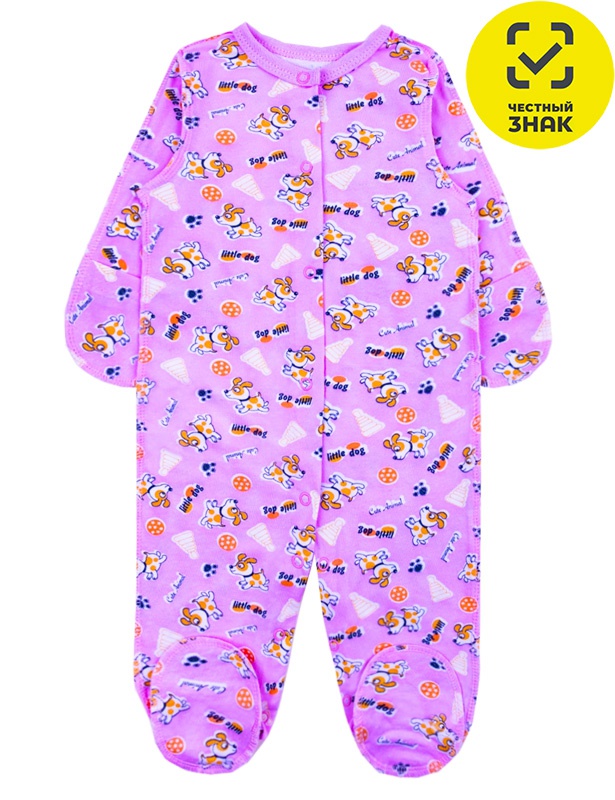 Комбинезон для новорожденного из набивного полотна, длинный закрытый рукав, закрытая ножка, центральная застежка на кнопки, ворот окантован и с застежкой на кнопку.