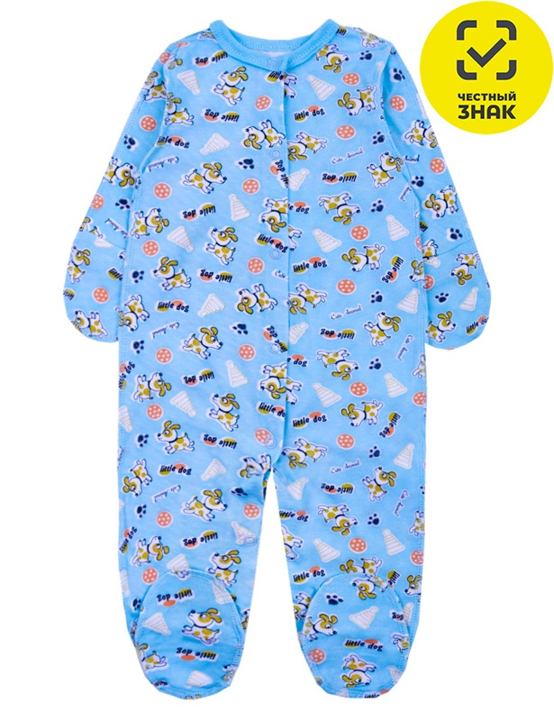 Êîìáèíåçîí äëÿ íîâîðîæäåííîãî èç íàáèâíîãî ïîëîòíà, äëèííûé çàêðûòûé ðóêàâ, çàêðûòàÿ íîæêà, öåíòðàëüíàÿ çàñòåæêà íà êíîïêè, âîðîò îêàíòîâàí è ñ çàñòåæêîé íà êíîïêó.