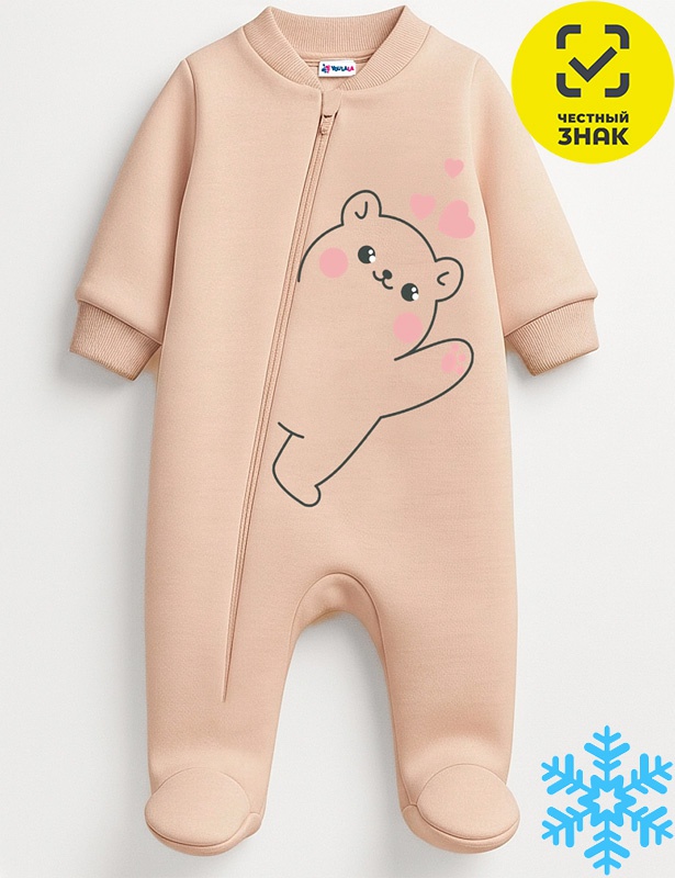 Комбинезон ясельный из футера трехнитки с начесом, длинные втачные рукава на манжете, ассиметричная застежка на молнию, воротник-стойка, закрытая ножка, декорирован принтом.