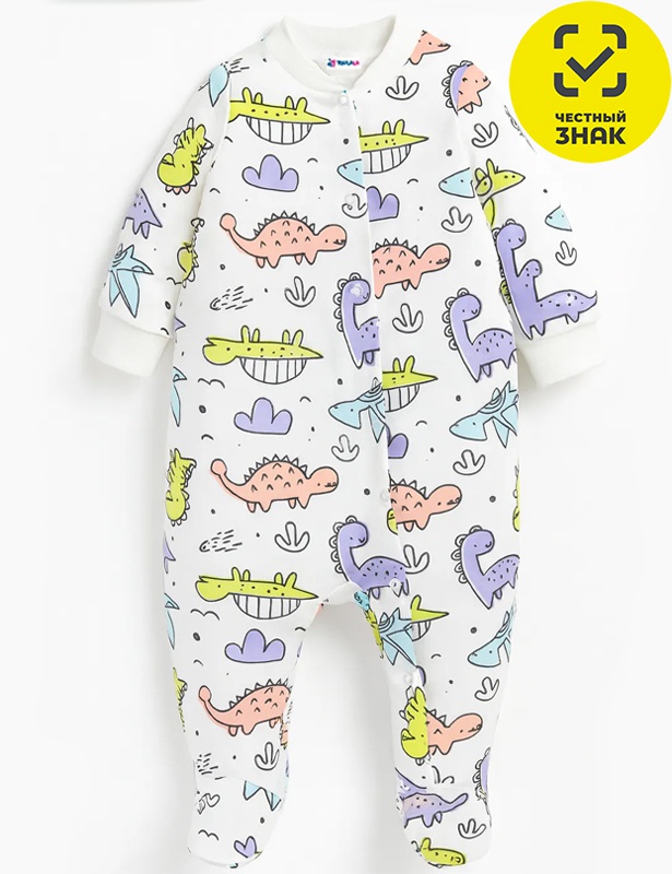 Комбинезон ясельный из набивного футера двухнитки с начесом, длинный открытый рукав на манжете, асимметричная застежка на кнопках, воротник-стойка, закрытая ножка.