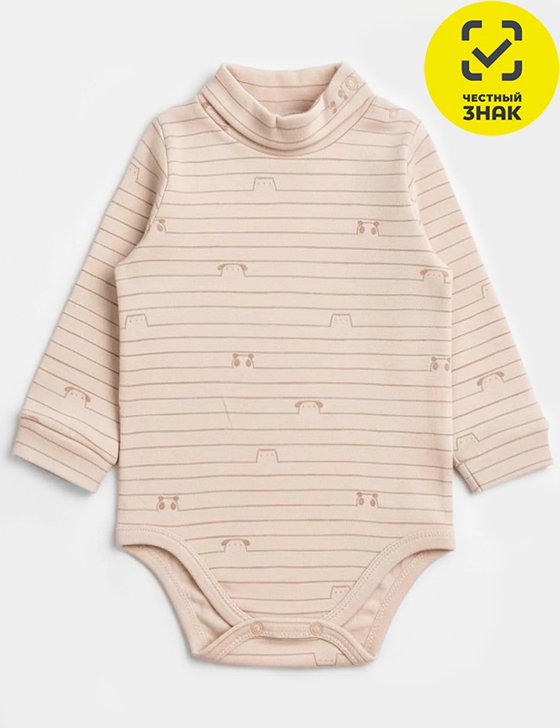 Боди ясельное из набивного полотна интерлока, с длинными втачными рукавами с манжетами, застежка на кнопки, горловина «гольф».