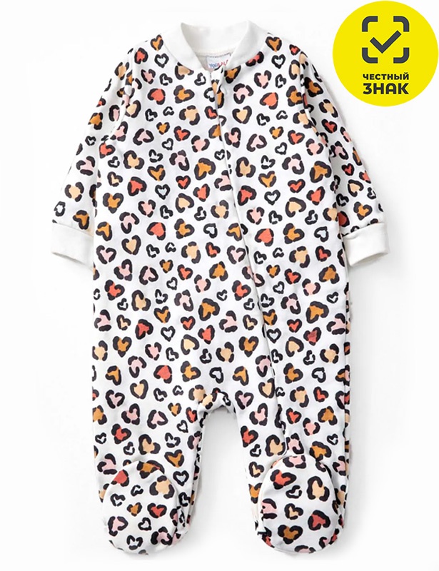 Комбинезон ясельный из набивного полотна, длинный открытый рукав с манжетом, смещенная застежка на молнию, воротник-стойка, закрытая ножка.