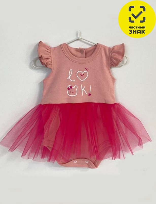 Боди-платье ясельное, с короткими рукавами-крылышко и юбкой из фатина. По низу изделия застежка на кнопки.