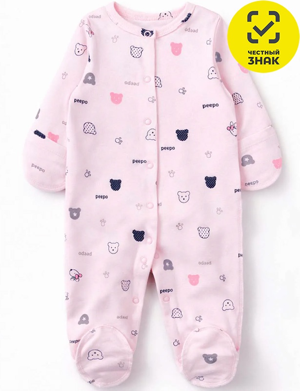 Комбинезон для новорожденного из набивного полотна, длинный закрытый рукав, закрытая ножка, центральная застежка на кнопки, ворот окантован и с застежкой на кнопку.