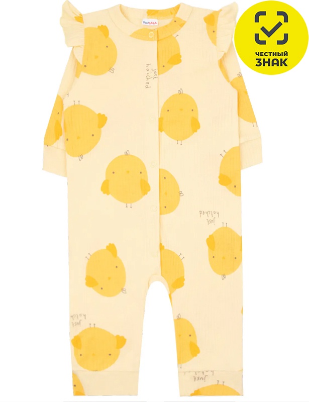 Комбинезон ясельный из набивного полотна, длинный открытый рукав, в пройме рюша, центральная застежка на кнопки, воротник круглый, открытая ножка.