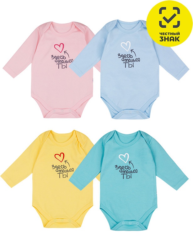 Боди ясельное из однотонного интерлока, на полочке принт, длинные рукава, застежка на кнопки по шаговому шву.