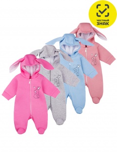 Комбинезон ясельный с длинным рукавом на манжете из гладкого футера с подкладом, ножка закрытая, молния проходит по центру, капюшон с ушками, на полочке печать "зайка".