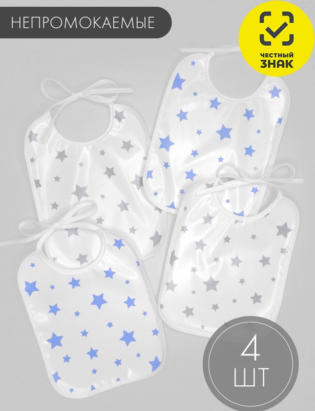 Нагрудники непромокаемые. Верх - водонепроницаемое покрытие, низ - тканевая основа. Размер 25х20 см. Застежка на завязках. В комплекте 4шт, цена указана за комплект.