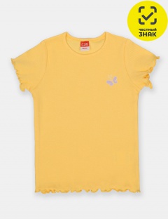 Футболка для девочки из мягкого трикотажа в рубчик. Горловина круглая. На плече застежка на кнопки. Край рукава и низ изделия слегка волнистый, что придает более игривый вид. На полочке расположена шелкография в виде бабочки.
