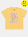 Футболка для девочки из мягкого трикотажа. Слегка расширенный силуэт. Горловина круглая, оформлена кашкорсе. На плече застежка на кнопки. На полочке выполнена шелкография в виде надписи - только хорошие флюиды.