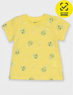 Футболка для девочки из мягкого трикотажа с принтом в виде груш. Горловина круглая, оформлена кашкорсе. На плече застежка на кнопки. Рукав-фонарик.