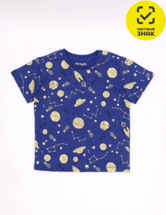 Футболка для мальчика из мягкого трикотажа с принтом в виде планет, силуэт свободный со спущенным плечом. Горловина круглая, оформлена кашкорсе. На плече застежка на кнопки.