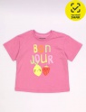 Футболка для девочки из мягкого трикотажа. Горловина круглая, оформлена кашкорсе. На плече застежка на кнопки. Силуэт свободный со спущенным плечом. На полочке выполнена шелкография в виде фруктов и надпись - приветствие.