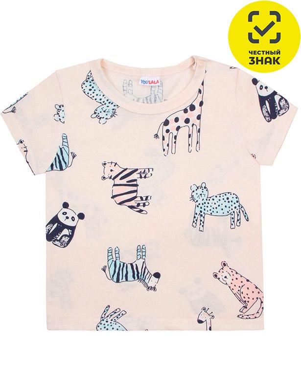 Футболка ясельная из набивного полотна, короткие втачные рукава, округлый вырез горловины, окантованный бейкой из основного полотна, застежка по плечу на кнопки.