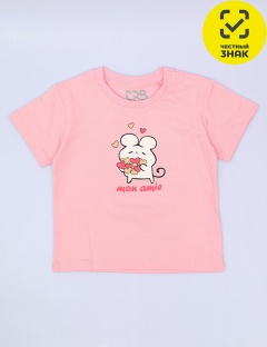 Футболка для девочки свободного кроя выполнена из мягкого трикотажа. Горловина круглая, оформлена рибаной, по плечу расположена застёжка на кнопки. На передней части футболки размещена шёлкография с изображением мышки, держащей охапку сердечек. Надпись на французском языке «моя подруга»