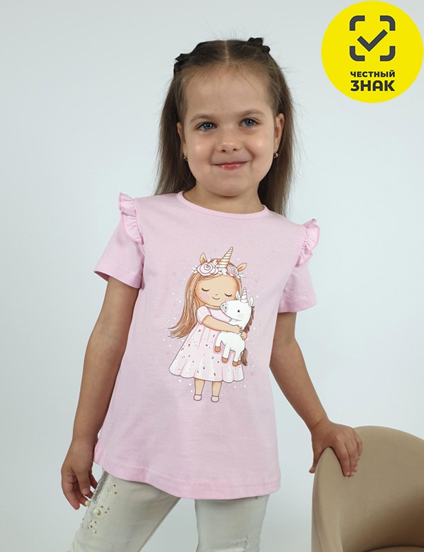 Футболка для девочки, выполнена из кулирного хлопкового полотна, силуэт трапеция, короткий втачной рукав, в пройме рюша. Горловина окантована, застежка на пуговицу по спинке. Печать на переде.