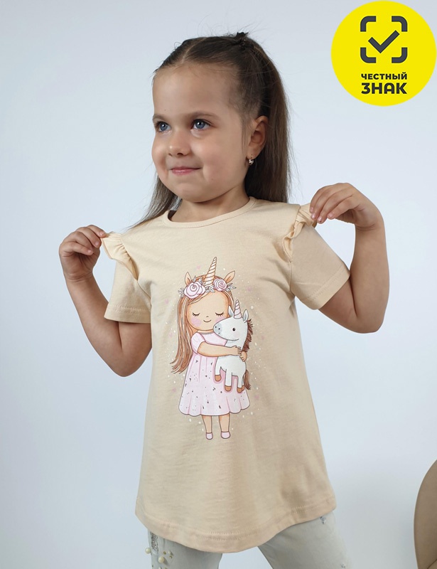 Футболка для девочки, выполнена из кулирного хлопкового полотна, силуэт трапеция, короткий втачной рукав, в пройме рюша. Горловина окантована, застежка на пуговицу по спинке. Печать на переде.