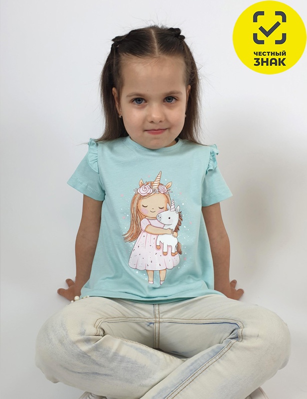 Футболка для девочки, выполнена из кулирного хлопкового полотна, силуэт трапеция, короткий втачной рукав, в пройме рюша. Горловина окантована, застежка на пуговицу по спинке. Печать на переде.