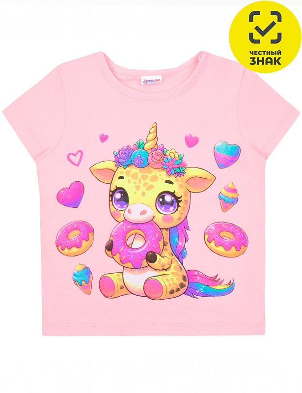 Футболка из гладкокрашеного полотна с принтом на полочке, короткие втачные рукава, округлый вырез горловины, окантованный бейкой из основного полотна, застежка по плечу на кнопки.